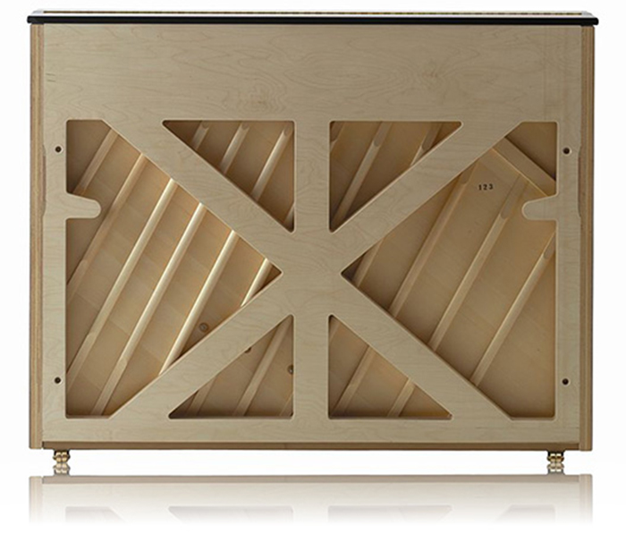 創業以来、常にオリジナリティ溢れる技術革新で躍進を遂げてきたグロトリアンピアノ。その代表的な特長のひとつにアップライトピアノの背面構造が挙げられます。特許も得ているこの星型の支柱は、ピアノ弦の強い張力に平衡をもたらし、音に安定性と伸びやかな広がりを持たせています。実際に当社ショールームで試弾される方のほとんどが、その音やタッチがグランドピアノにも匹敵すると驚かれるほどです。