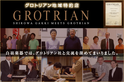 世界中の多くの専門家が絶賛するグロトリアンピアノ。ダイナミックでありながらバランスのとれた緻密な音色は他のどのピアノにも似ていない独自性を誇ります。「単に良い音を追求するだけでなく、次世代へと受け継がれるピアノを」という職人の真心が込められてるからでしょう。私たち白羽楽器も、生涯愛せるピアノとしてこのグロトリアンをお薦めいたします。まずは是非ピアノに直に触れてみてください。当社ショールームにてお待ちしております。