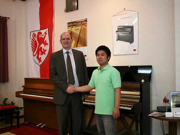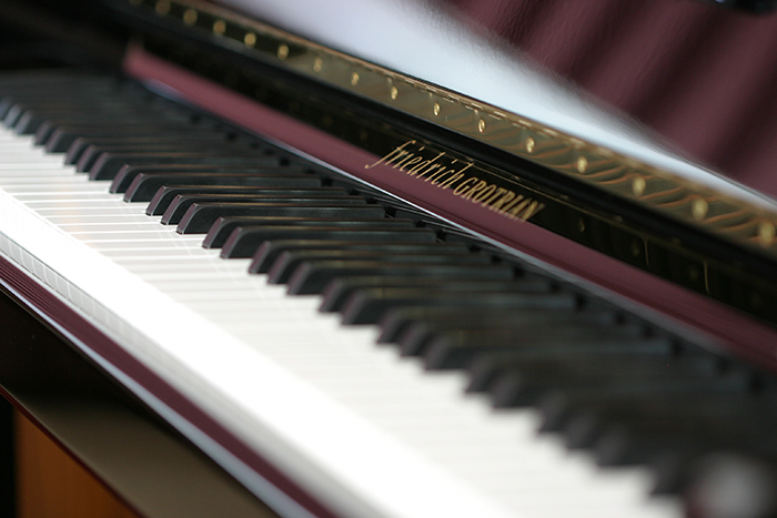 アップライトにするかグランドピアノにするかなど、ご希望を絞り込まないでのご来店でしたので、ショールームでご覧いただけるそれぞれのピアノの特徴を説明させていただきました。そして、何台ものピアノの中から、グロトリアンのフリードリッヒをお選びくださいました。