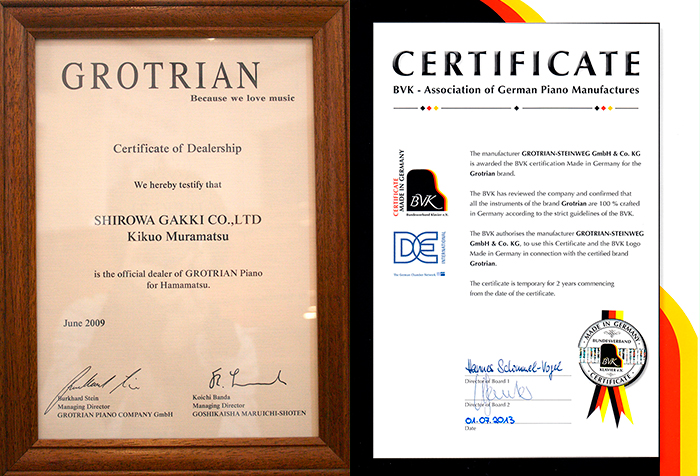ピアノの歴史が始まって以来、ドイツほど多くのピアノ職人が個性豊かなピアノを造り続けてきた例は世界のどこにもありません。そんなドイツで組織された「ドイツピアノ協会(BVK)」がグロトリアンに対して発行した品質証明書は、100%「Made in Germany(ドイツ製)」 ということを認定しています。 グロトリアンピアノは、経験豊かな職人の手により作り上げられ、無数の工程や数千に上る部品、丁寧に選ばれた材料と加工方法を組み合わせ真心を込めて製作されます。 こちらの証明書は、グロトリアンピアノがパーツ一つに至るまでドイツにて製造されていることを表しています。 証明書は白羽楽器のショールームに展示しております。