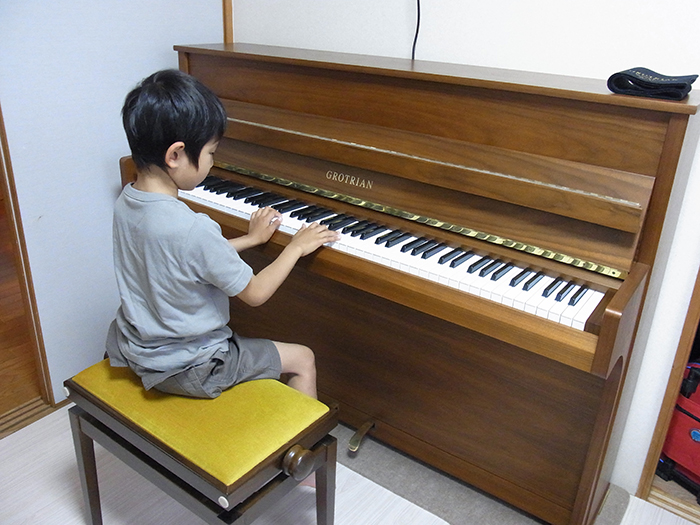 「グロトリアンについては何の知識もありませんでしたが、子ども達の理屈抜きに楽しそうな表情を見てグロトリアンを購入しようと決めたんです。アップライトとは思えないほどの迫力と、透明感のある音にも驚きました。音・タッチ共にグランドピアノに匹敵するピアノだと思います。コンパクトでスペースを取らないところも嬉しいですね。」と奥様。 後日調律のためご自宅へお伺いすると、2人のお子様が嬉しそうに練習されていました。