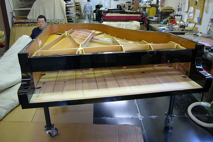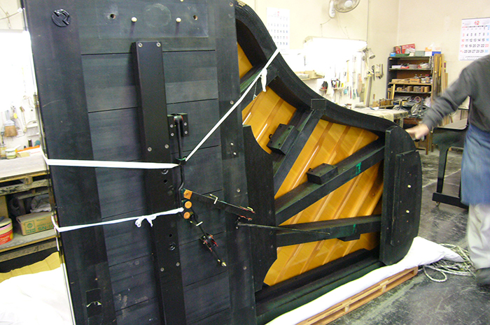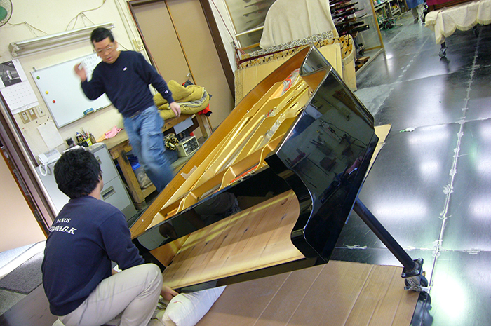 外装を全塗装する為、ピアノを解体し専門の塗装業者へ搬入