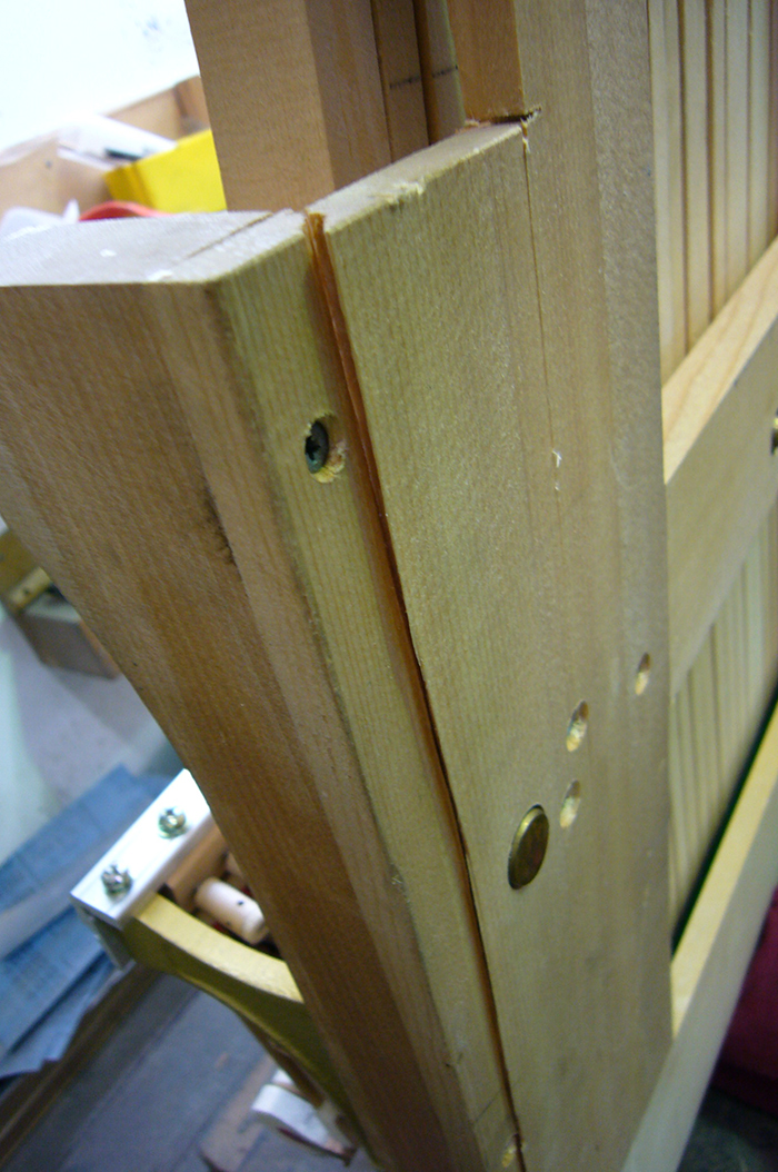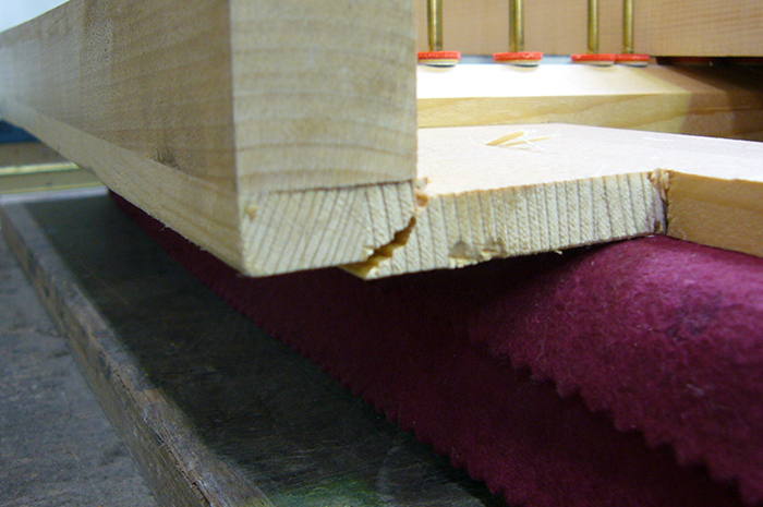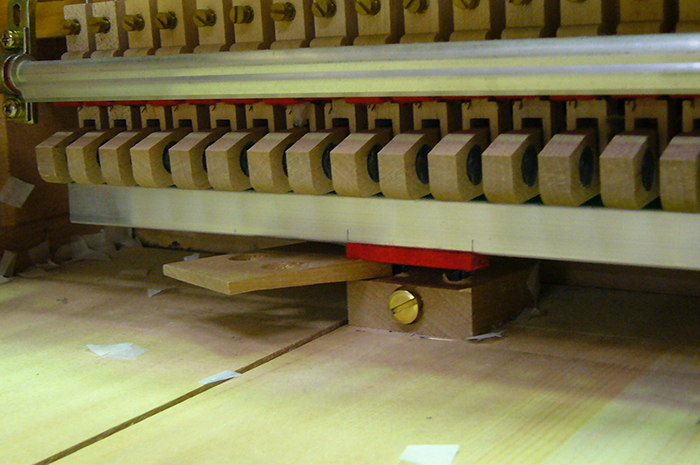 角蝶番の変形や、内部鍵盤、アクションの土台となる「おさ」という部分にも亀裂が入っており、ここの場所については演奏にも影響する為、入念な修復が必須である。