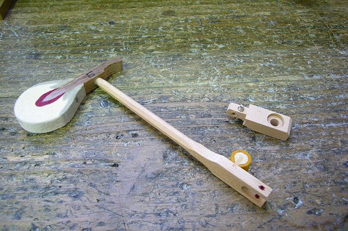 後ろ脚を取り付ける為のパーツ(半月)やアクションを支える土台、前脚を取り付ける為に重要な棚板を組み付けピアノを起こします。