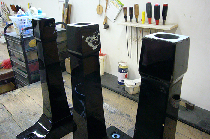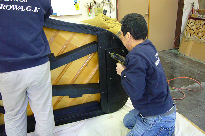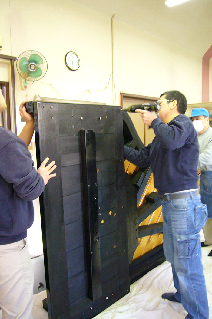 塗装の仕上がったピアノを工場内に搬入、パーツを組み付けていきます。