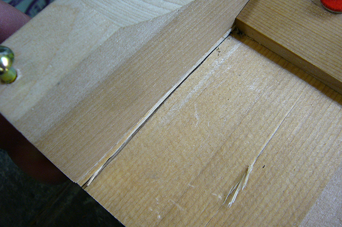 亀裂が発生した場所が、接着だけでは強度不足により運搬時にまた開いてくる恐れが有る為、亀裂に接着剤を流し込み、その上から合板を一枚張って強度を稼ぐ事にしました。